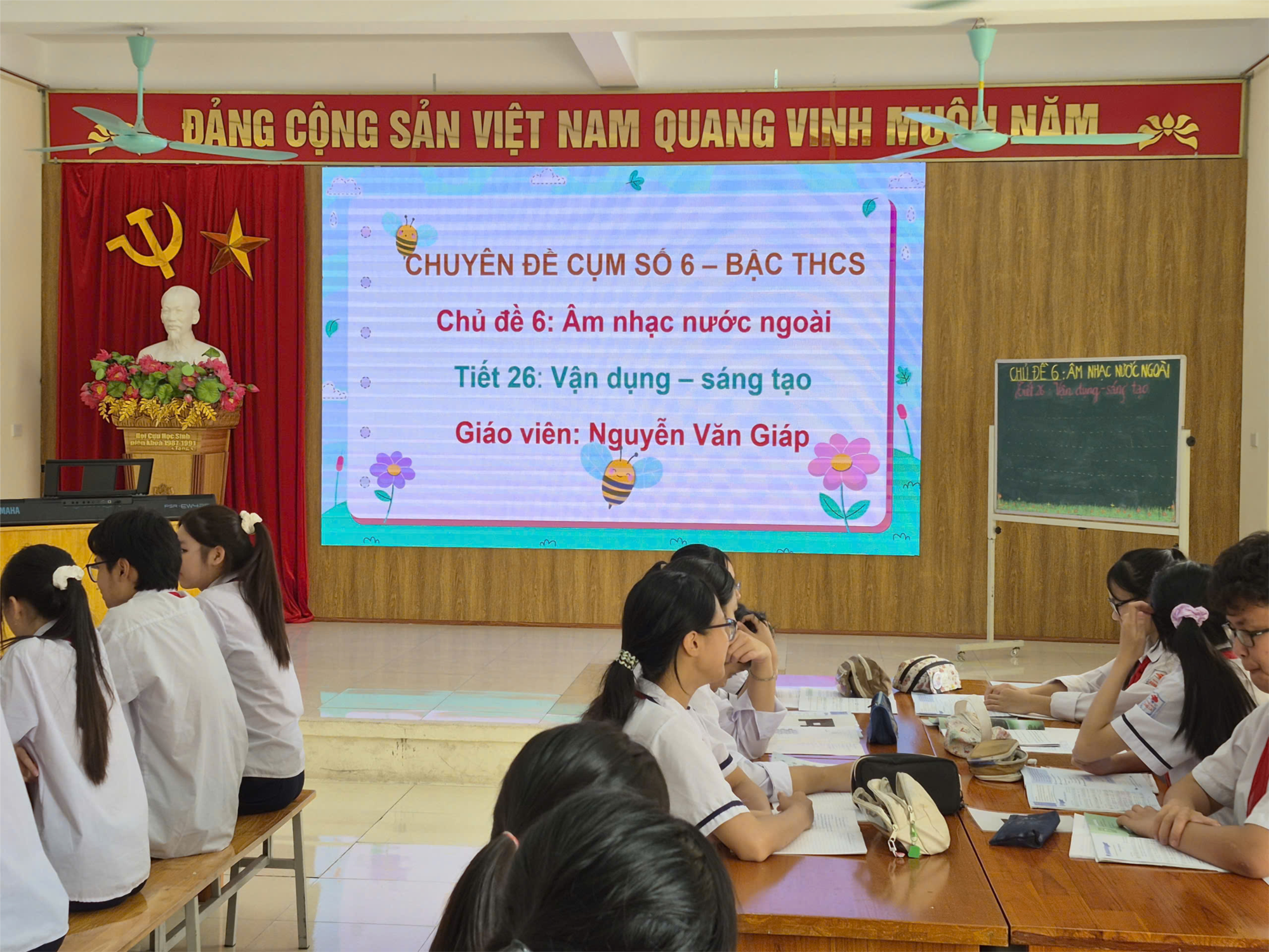 Tại buổi sinh hoạt, thầy giáo Nguyễn Văn Giáp đã thực hiện tiết dạy minh họa môn Âm nhạc lớp 8 với Chủ đề 6, tiết 26: “Vận dụng sáng tạo”. Tiết học được chuẩn bị công phu, nội dung bám sát định hướng phát triển phẩm chất và năng lực học sinh, đồng thời tạo được không khí học tập sôi nổi, hấp dẫn.